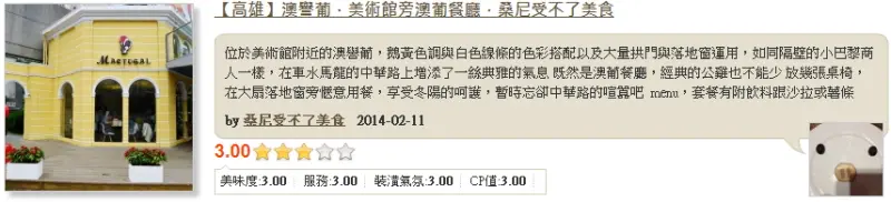 位於美術館附近的澳譽葡,鵝黃色調與白色線條的色彩搭配以及大量拱門與落地窗運用,如同隔壁的小巴黎商人一樣,在車水馬龍的中華路上增添了一絲典雅的氣息,既然是澳葡餐廳,經典的公雞也不能少,放幾張桌椅,在大扇落地窗旁愜意用餐,享受冬陽的呵護,暫時忘卻中華路的喧囂吧!