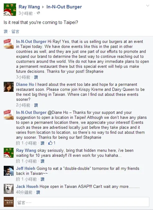據網友在臉書上詢問In-N-Out Burger官方粉絲團,是否於3/11(二)來台舉辦flash event,獲得官方答覆是『Yes!!』