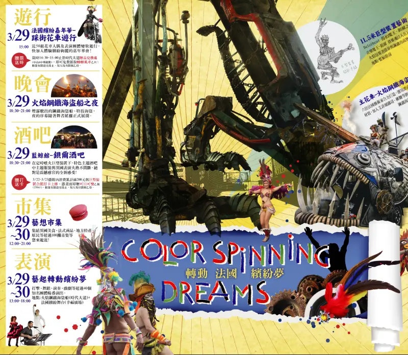 3/29~3/30的嘉年華盛會,特別邀請法國尼斯及美國藝術團隊跨國合作,歷經3個多月,運用20噸回收鋼鐵材質打造11.5米巨型裝置藝術-「Belzebuth beat節拍魔王。鋇爾之聲」,實地創作鋼鐵及火之藝術完美結合。此外,還有異國美食、法式商品、地方特產、原民市集等超過100攤特色攤位,以及打擊樂團、舞蹈、音樂演奏、兒童戲劇、十鼓擊樂團、九天民俗技藝團、明華園星字團、如果兒童劇團、泰武古謠傳唱、嬉班子非洲鼓隊等超過40個知名表演藝術團體輪番演出,歡迎大家週末一起來時代大道轉動法國繽紛夢!