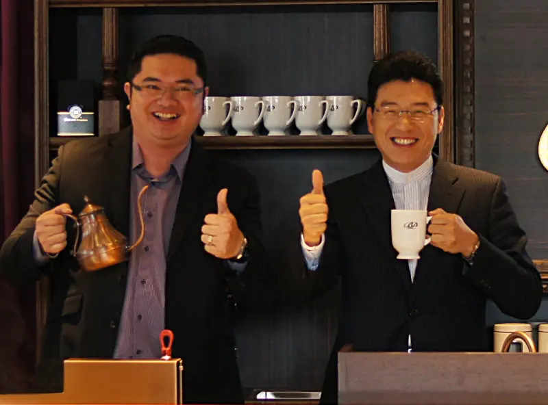 照片說明:西雅圖極品咖啡協理與謝震武律師推薦精品咖啡。