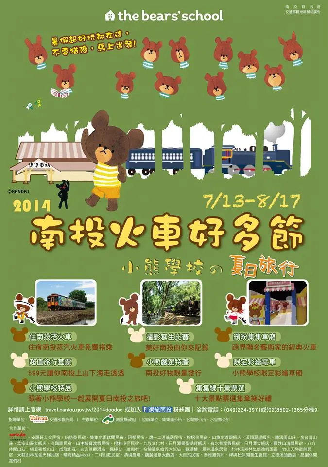 搭乘蒸汽火車暢遊集集線、活潑有趣的小熊學校展館、一系列的好康活動,南投火車好多節滿足全家人對夏日輕旅行的渴望。每年透過卡通人物代言集集線,已成為火車好多節的傳統,來自日本愛好旅行冒險的小熊學校,今年將在集集線陪大家度假,繪本場景都將在集集驛站一一展現,小熊們也將化身小導遊帶你走進綠色隧道介紹集集小鎮各景點;集集車站也首度與小熊學校結合,佈置成小熊集集車站,小熊們將在車站開心迎接遊客的到來。