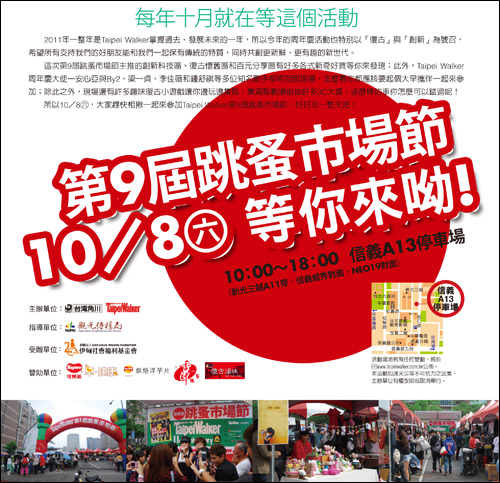 所以10/8(六),大家趕快相揪一起來參加Taipei Walker第9屆跳蚤市場節,好好玩一整天吧!