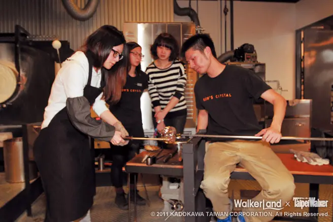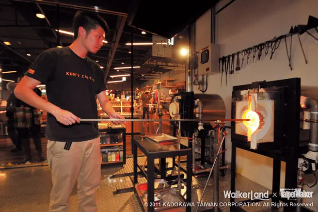 位於誠品生活松菸店2樓的坤水晶除了販售琉璃製品外,還有提供現場製作玻璃的教學,先挑選好想要製作的款式後,即由老師一對一的協助完成,30分鐘左右的時間讓學員有紮實的體驗,將玻璃膏經由1千多度的高溫溶燒後,再以口吹塑型。不論是生活用品、花器等的製作,都可以親自來體驗。