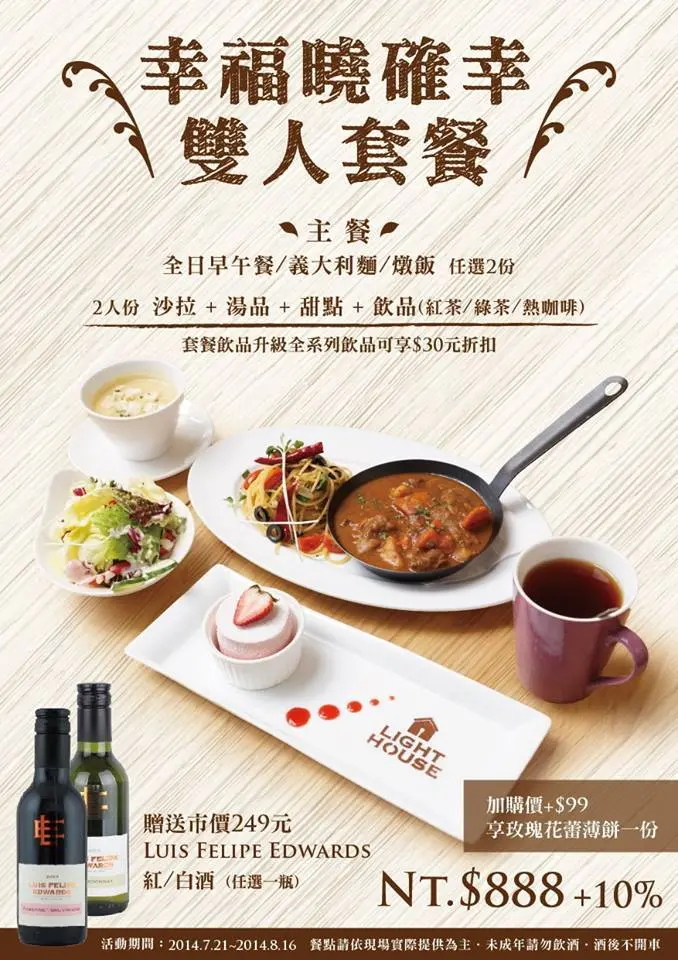 套餐內容:主餐(全日早午餐/義大利麵/燉飯)*2份、健康沙拉*2份、精選湯品*2份、特製甜點*2份、飲品*2(紅茶/綠茶/咖啡)*飲品更換可折抵30元