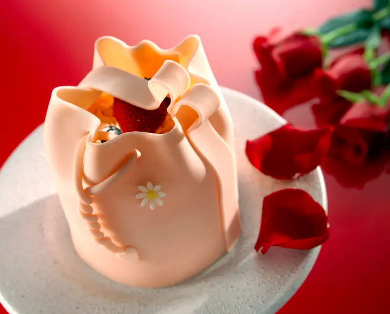 香格里拉台北遠東國際大飯店主廚以代表浪漫少女心的粉紅色,與令女孩著迷的精品側背包為外型發想,吸睛指數十足。以各一磅的糖、麵粉、蛋、和奶油並加入新鮮柳橙製成紮實的柳橙口味磅蛋糕,外表再以白巧克力加入來自保加利亞的玫瑰醬,打造不規則且在視覺上具有柔軟感的圓筒外型;切開前別忘了先欣賞包內最上層朵朵綻開滿佈的玫瑰花造型巧克力,浪漫滿點。