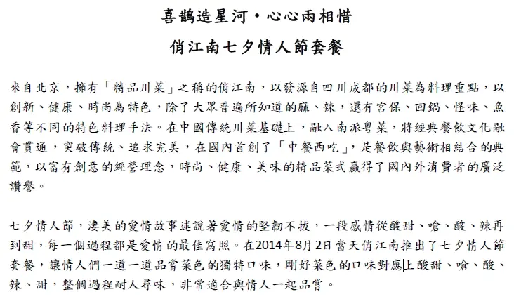 今年七夕,台北國賓大飯店A CUT STEAKHOUSE於8月2日當晚提供「仲夏熱情七夕情人饗宴」,每位2,900元起;ahmicafe’推出「七夕情人節海陸套餐」,每位1,000元起;明園西餐廳情人節當日不調漲價格外,升級多樣菜色,讓情人們度過甜蜜夜晚;另外le bouquet繽紛蛋糕房則推出融心甜蜜巧克力禮盒14入 甜蜜價NT$999,讓小倆口甜蜜品嚐多款融口心醉的法式頂級巧克力。