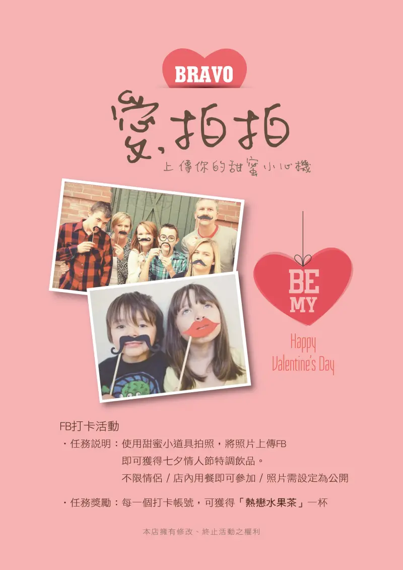 七夕情人節系列活動,即日起至8月17日到布娜飛各分店用餐,拿起各式鬍子、眼鏡、紅唇小道具,不管是情侶、朋友、家人都一起來拍拍,打卡上傳你的照片,即可得到特調「熱戀水果茶」,享受放閃的甜蜜滋味!