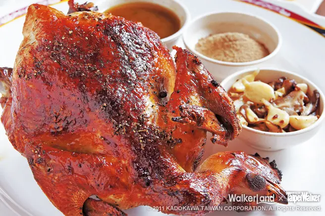 蘭陽首創烤雞名店,老闆從雲林古坑轉戰宜蘭礁溪。嚴選130~150天上等放山黑毛土雞,利用香料將全雞醃浸入味,再放進得過專利的烤爐中燜烤。以龍眼木為火材,先低溫燜烤後提出降溫,再高溫烘烤,過程雖然繁複,卻能緊緊鎖住肉汁與肉香,整隻雞肉質滑嫩、香Q多汁,讓人口涎直流。![]()