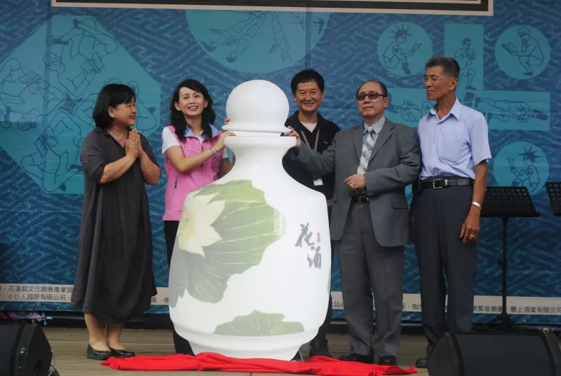 ▲ 照片說明:左起由文化局秘書江家珍、市長夫人張美慧、花蓮文創園區副總經理傅廷暐、奇匠國際股份有限公司董事長汪建勳及鑫禧酒廠廠長陳秉達等人一同為花創花酒節首次發表站台。