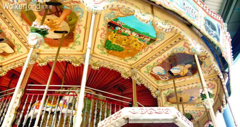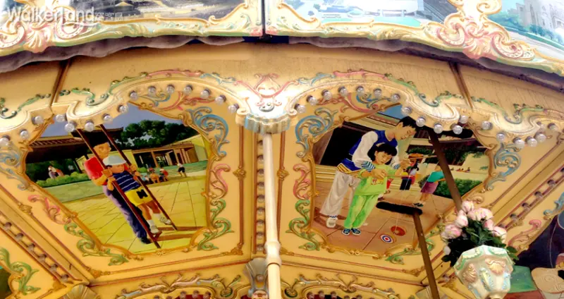 ▼ 真的是兩個神經病,好端端的音樂馬車不好好坐,你抬頭看看天花板上的畫作多精緻,是仿古閩式建築群的「昨日世界」,雖然昨日世界已於2014年3月2日正式熄燈,但是童年的我們,玩過的踩高蹺和扯鈴,永遠都存在我們心中喔!