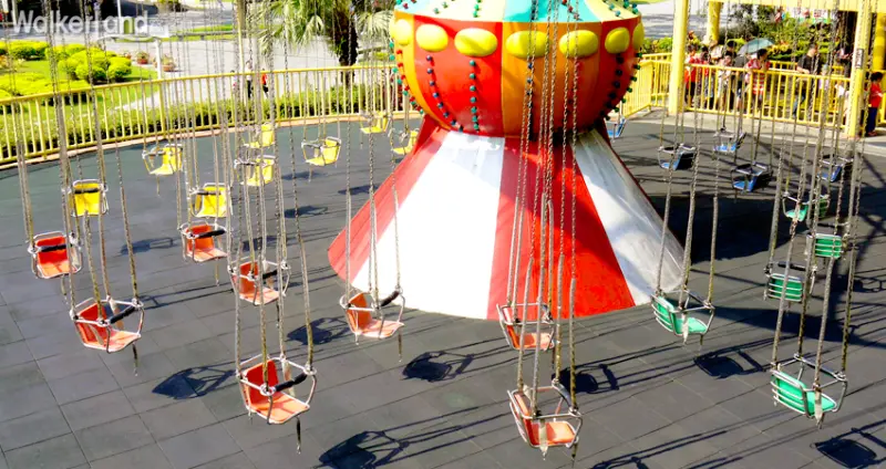 ▼ 跟咖啡杯比較起來,雖然都是繞圈圈的遊戲,而且輻射飛椅的弧度不僅比較大,還飛上天了,但暈頭指數卻沒有那麼高,我想應該是被涼風和美景佔據了心思,有一種鳥兒徜徉天空的飛翔感。