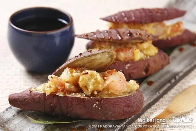 ↑↑↑將炒熟的蝦仁、干貝填回挖空的地瓜裡,可再灑些起司粉後,放入烤箱再烤5分鐘即可。