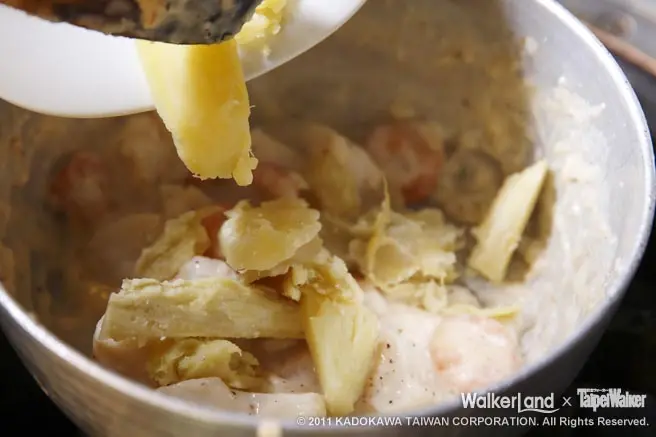 ↑↑↑在鍋內放入奶油,依序將蝦仁、干貝放入鍋內炒熟,放入些許低筋麵粉拌勻,再入加鮮奶以及胡椒、鹽調味,最後將剛挖出的地瓜放入鍋內拌勻。