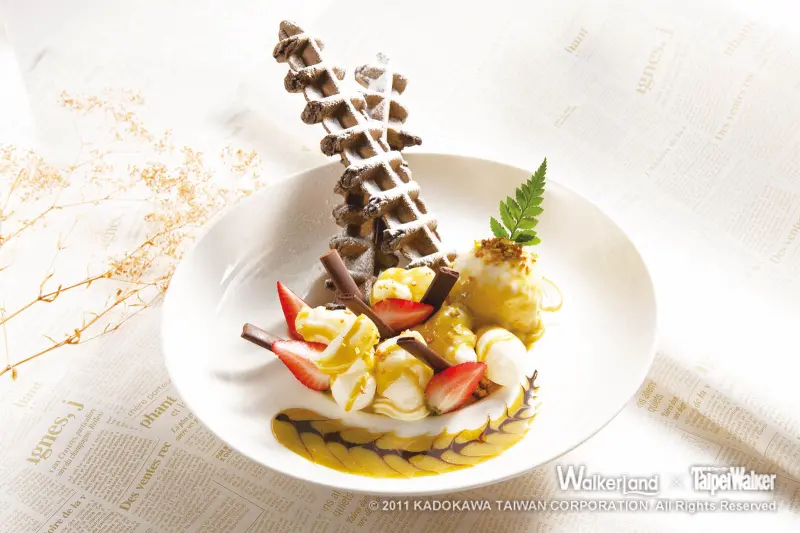 店內新推出的創意甜點新品,主廚以巴黎鐵塔為概念製作出造型鬆餅,並將麻糬包覆在鬆餅裡,外脆內Q軟,再搭配開心果口味冰淇淋、草莓一起吃,冷熱雙重口感與酸甜滋味帶來幸福感受。