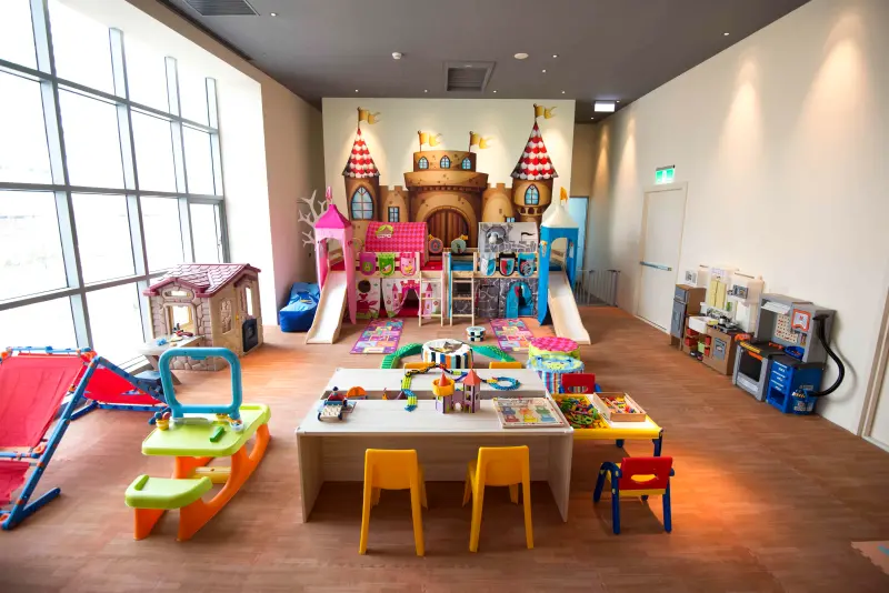 另外,餐廳一隅則規劃為親子遊戲區,特別引進來自丹麥的芙萊莎(FLEXA)兒童家具,其經過歐盟嚴格地檢測,以符合國際安全的最高標準,並達到無毒兼具環保的目標,不僅讓小朋友玩得開心,更讓家長放心!遊戲區設有幼兒溜溜房、鳥窩館、夢幻城堡塔與閱讀小角落等。此外,餐廳貼心備有安全的親子餐具與兒童座椅,員工則以親切、專業的服務態度,打造歡樂溫馨的遊樂世界。