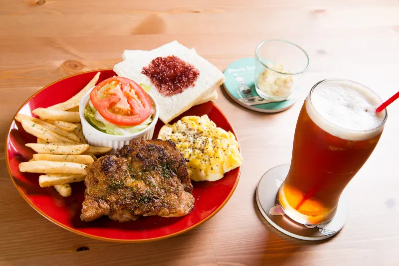 雞腿排以香煎燒烤的方式烹調過後,完整鎖住肉汁,肉質鮮嫩彈牙,香氣十足;套餐搭配吐司、薯條、炒蛋、生菜沙拉,另附贈美式咖啡或紅茶。除了雞腿排,店內另提供香煎豬柳排與香檸雞柳條等早午餐選擇。