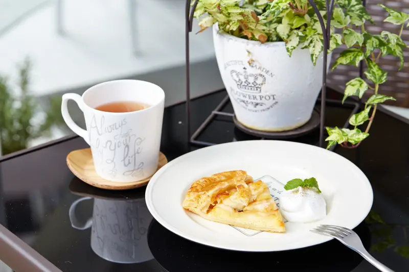 選用日本富士蘋果搭配甜白酒一起熬煮製成的蘋果派,口感酥脆,為冬天期間限定甜點。果茶則是使用KUSMI TEA四味紅漿莓果茶,再搭配店內自製販售的手工果醬沖煮而成。