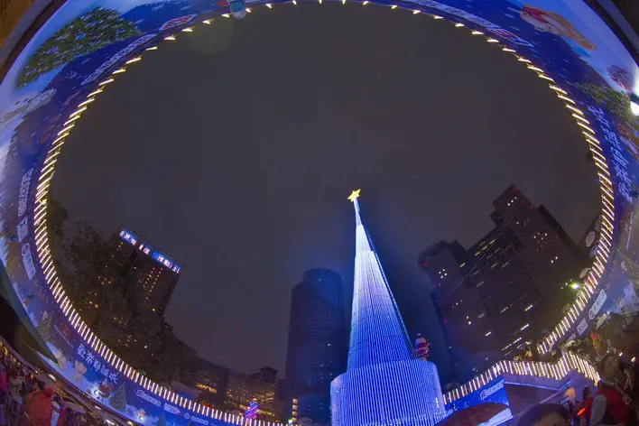 以2700支、每支1米的LED燈管打造成全國最高的LED耶誕樹,每個燈點都能發出256色*256色,總計6萬多種顏色,經由燈管組合表現生動的電腦動畫與圖示,今年將展演3分55秒的主燈秀,耶誕小熊繞著耶誕樹轉圈圈,耶誕老公公從天而降,全新的設計增添趣味性與故事性。