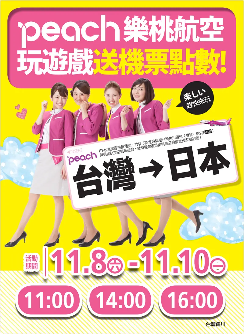 ITF台北國際旅展期間,於以下指定時間至台灣角川攤位(世貿一館2樓H517)與樂桃航空空姐玩遊戲,就有機會獲得樂桃航空機票或獨家贈品喔!
