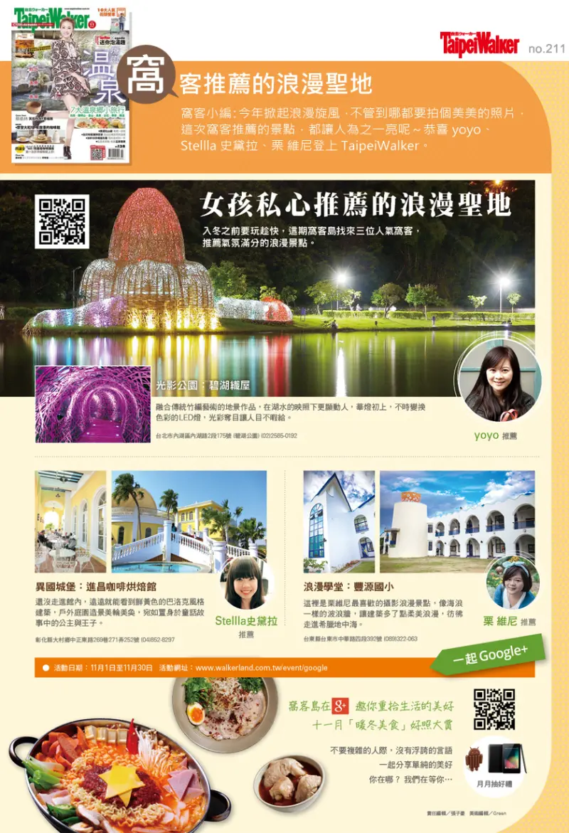 天涼泡湯最好!本期Taipei Walker 主題特輯「七大溫泉鄉小旅行」,介紹台灣各地的美好湯泉,你一定要來試試!除了暖呼呼的溫泉,窩客島搶鮮報也特別推薦「浪漫景點」,讓情侶們一起手牽手約會去。這次編輯群們依文章內容、照片美感及景點特色,從網站上找出三位人氣窩客,恭喜三位幸運的窩客登上Taipei Walker 十一月號。