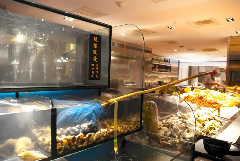 品花苑還推出「每日海鮮區」,民眾可自行現場捕撈鮮蛤與活蝦,再交由主廚料理。創新引進的「便利超商區」,提供便利商店60多款飲品供消費者挑選。