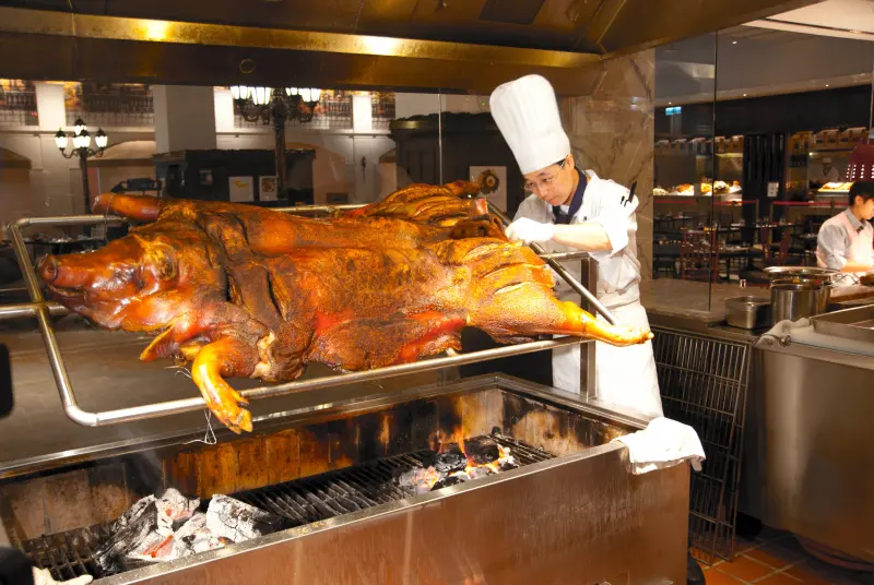 最吸睛的是蒙古烤肉區,民眾在一旁的自助吧挑完主菜與佐料後,主廚會放到大鐵盤上現場表演製作過程。
