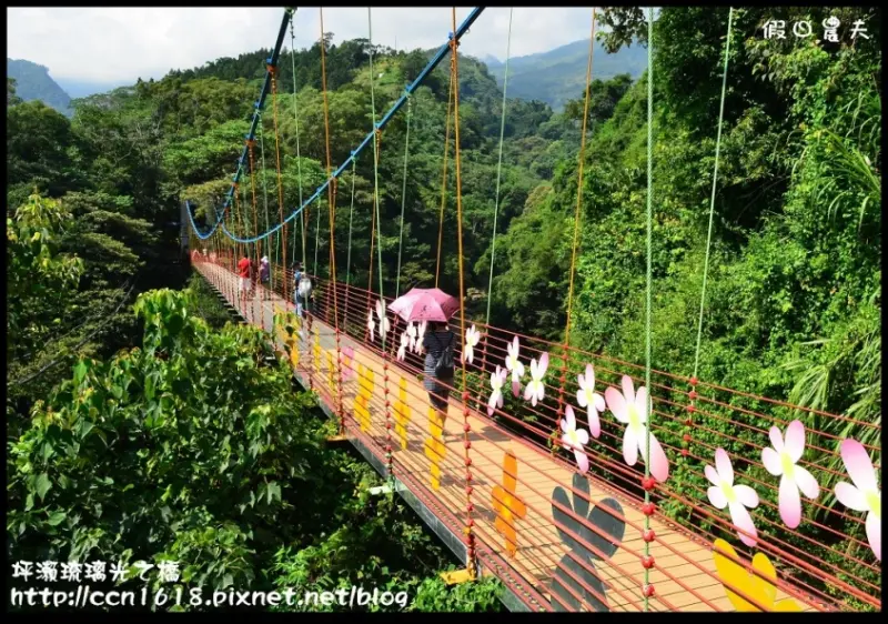 窩客「假日農夫」推薦:琉璃吊橋主體全長88公尺(玻璃橋面54公尺),橋面距溪谷深50公尺高度,橋纜繩索塗上亮眼彩漆,橋圍欄上點綴在地農特產葡萄及桐花圖騰,鮮麗奪目。