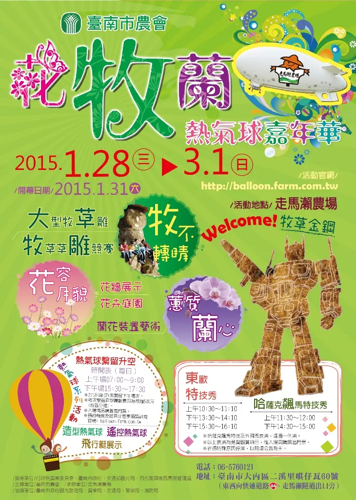 臺南市農會總幹事吳正仁表示,以專業牧草種植起家的走馬瀨農場,佔地120公頃,其中廣植40公頃異國風情紐西蘭盤固拉牧草,2015年寒假及新春期間,走馬瀨農場將結合牧草、花卉、蘭花交織成最令人期待的農業享宴,搭配在草原上、下漂浮的熱氣球搭乘體驗及曾獲世界造型排名第二的可愛獅王造型熱氣球、遙控飛艇展示、牧草草雕競賽作品展示、花卉庭園、蘭花裝置藝術、及多座大型牧草雕展示,包括長毛象、暴龍、見龍在田、獅子王、三羊開泰、走馬瀨意象造型,其中一座高達七米的牧草金剛,也將和大家見面