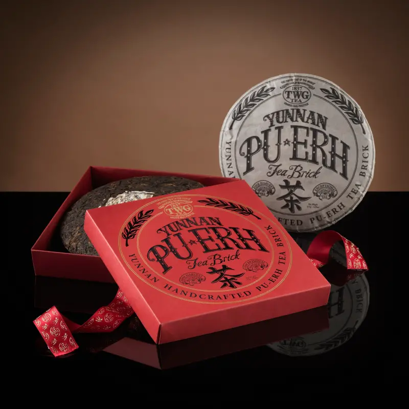 ▲ 照片說明:TWG Tea雲南普洱茶磚以奢華的霧紅亮金禮盒封裝,並以絲質緞帶點綴,為農曆新年的完美獻禮。