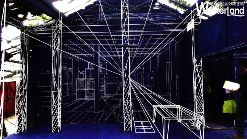 空間由虛到實慢慢變化,線條反而由實體變虛體,人們藉由空橋凌躍其間,望眼從立體3D素描空間還原歷史格局,再到牆面前延伸出的藍晒切半立體物件,最後從藍晒牆面裡看到過去與未來想像的生活景緻,形成新的藍晒立體畫。