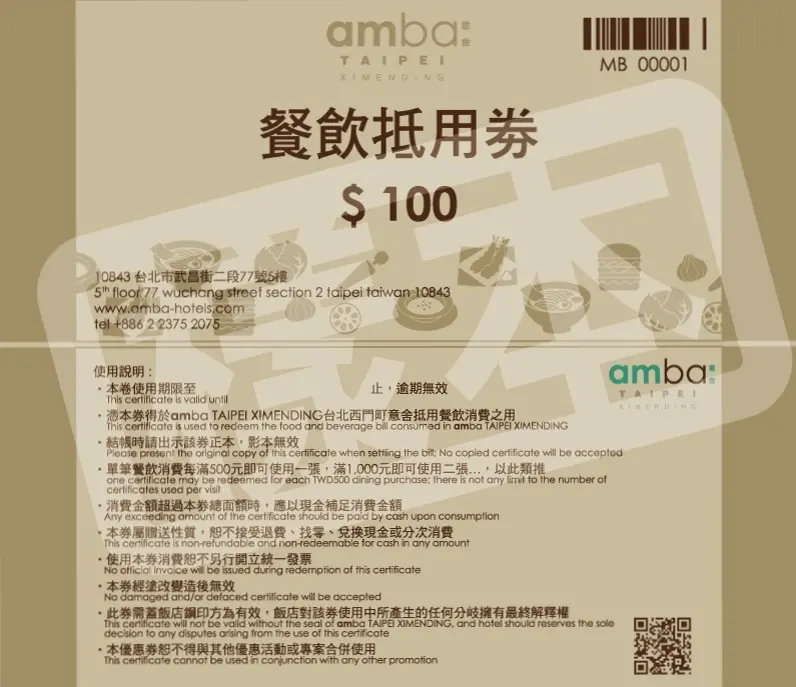 1. 本優惠得於amba TAIPEI XIMENDING台北西門町意舍抵用餐飲消費之用。