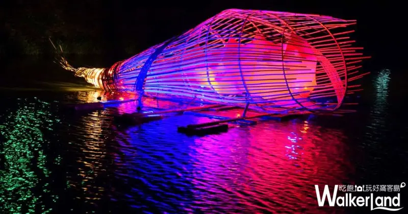 stellla史黛拉:月津天燈像萬花筒的抽象雕塑,彷彿靜止的天燈,照亮人間,促人反思快速消費的現代文明,光影倒映在水中,色彩好繽紛,上河饗宴在水面上以線條搭建出的趣味家具。