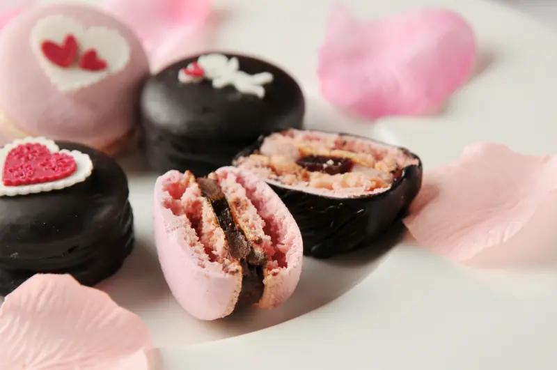 為達到健康與美味兼顧,為每位消費者嚴選全天然素材與原料,每款皆使用法國法芙娜巧克力與法國進口法定產區AOC依思尼鮮奶油,更絕無添加任何人工色素,巧卡龍則是將馬卡龍包裹著法芙娜瓜那拉苦甜巧克力,增添別致風味,每一款皆以手工刻劃雙色造型風格情人節應景立體圖騰,盡享甜蜜醉心戀愛滋味!