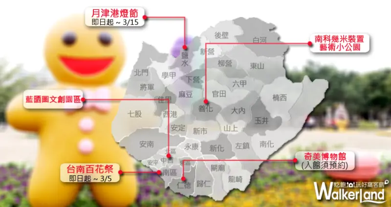 新的一年又到了,有準備好去哪裡玩了呢?2015年台南又多了好多新景點,從剛登場的月津港燈節,到超熱門的奇美博物館、藍晒圖文創園區,還有超可愛裝置的台南百花祭及南科幾米藝術小公園,喜歡旅遊的你去過那些了呢?如果都沒去過,走過、路過、千萬不要錯過這次的「台南走春懶人包」!
