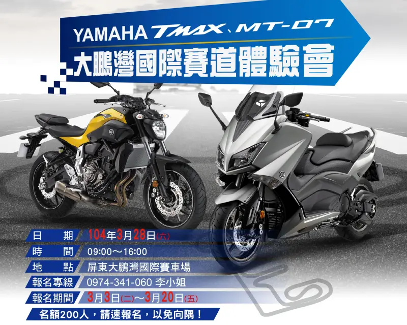 YAMAHA自引入TMAX 530及MT-07後,不僅深受顧客好評;更創造出亮眼的銷售佳績。為回饋車主的支持與喜愛,YAMAHA特於3月28日於屏東大鵬灣舉行「大鵬灣國際賽道體驗會」,邀請TMAX530、MT-07車主感受在國際賽道上馳騁的快感!活動當日也特別邀請YAMAHA Riding Academy教練-加藤 義昌先生(前全日本GP125年度冠軍)來現場同歡!完成體驗車主可獲得加藤教練頒發的獎章,機會難得!名額有限!