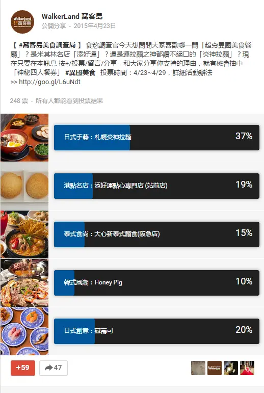 第一波票選超熱烈,連食慾調查官驚呆了!好啦,既然大家反應超級熱烈,本週調查官就來調查一下,大家心目中的「超夯異國美食」是哪一間呢?現在只要投下你最喜歡的餐廳,寫下你非去不可的原因,再把投票訊息公開分享出去,你就有機會可以帶著你的他/她一起吃大餐唷!本週人氣王究竟是米其林名店「添好運」?還是連拉麵之神都讚不絕口的「炎神拉麵」?快來幫你喜歡的餐廳站台拉票!