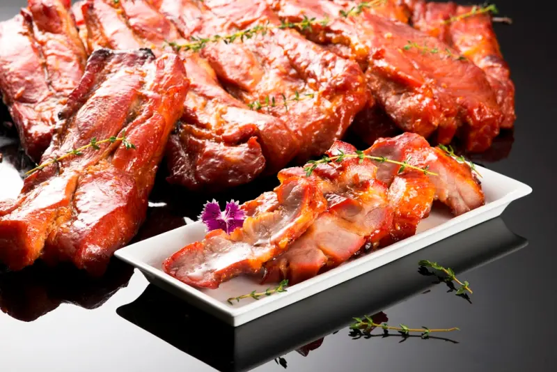 首先須將黑豚肉鬆化,之後以砂糖、鹽、海鮮醬、柱侯醬、豆瓣醬、南乳、生抽、蒜油、乾蔥等醃漬30分鐘後放入200度高溫的烤爐中燒烤, 10分鐘後改為以小火慢烤20分鐘後取出;此時淋上砂糖後將再度放入改為150度高溫的烤爐約10分鐘,直到外皮色澤均勻為止。盛盤後淋上以砂糖、香油、生抽、老抽、八角、桂皮、蠔油等調製而成的獨門叉燒醬,如此極致燒臘美味將在您口中散開。