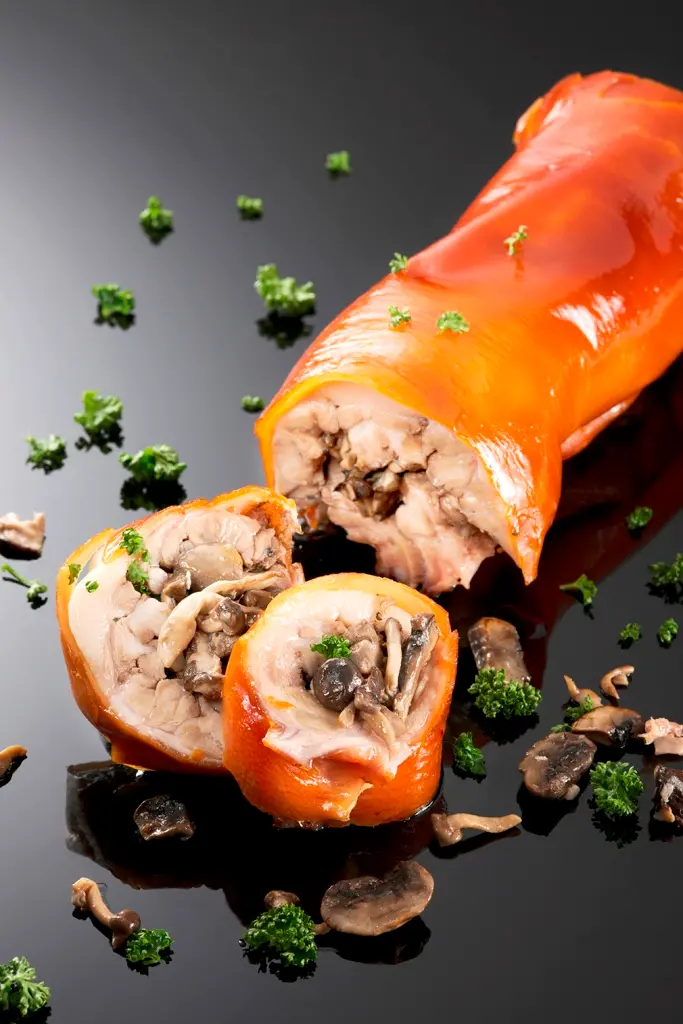 主廚將豬隻以鹽和孜然粉醃漬40分鐘入味,接著將豬隻的手腳定型後放入鹽水汆燙,熄火後待30分鐘,接著將鮑魚菇與鮮冬菇以黑松露和蠔油等調味炒過後放入豬肚內爐烤30分鐘、再放入爐內燒烤20分鐘,令人垂涎三尺的整隻野菌燒金豬美味上桌。採用鮮菇放入乳豬內是主廚的創新研發,不僅可增加野味的香氣,同時在視覺上也增添了吸引力。