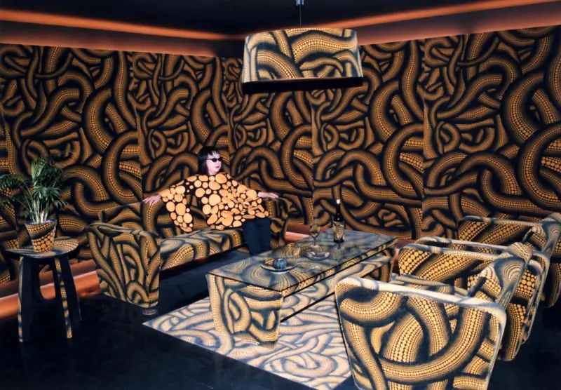 ▲草間彌生身披自己設計的洋裝坐在「愛知3年展2010」參展的草 間展示間裡面。房間牆壁、桌椅全部都覆上彎彎曲曲的圓點圖案 ,扭曲觀眾的遠近感。 (圖 Copyright © YAYOI KUSAMA 提供)