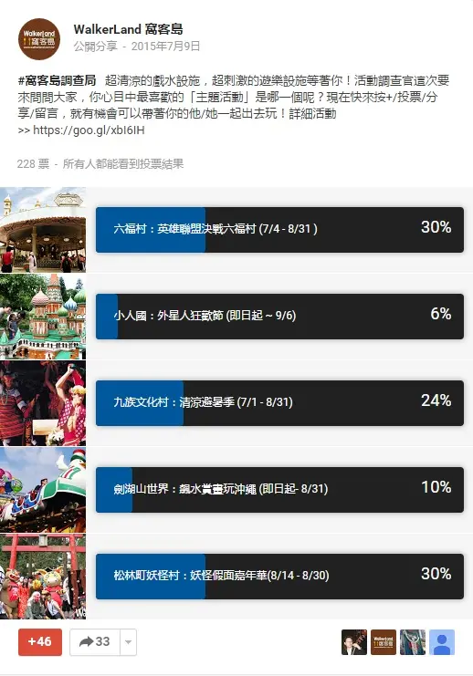 活動調查官:以上五個「超熱門的主題活動」,你最喜歡哪一個呢?現在調查官就來問問大家心目中最喜歡的活動是一個呢?快來「窩客島Google+帳號」投下你最愛、最喜歡的活動,和大家分享你喜歡原因,就有機會抱走「六福村雙人套票」(1名)! >> 立即參加 >>