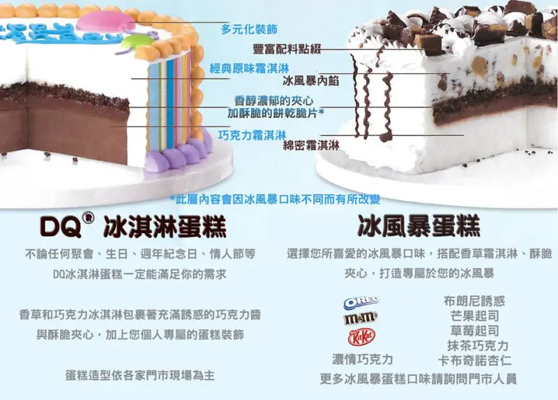 DQ冰淇淋蛋糕,冰風暴蛋糕可與家人朋友分享的三明治、得意棒、家庭號冰淇淋,還有亞洲僅有台灣販售的DQ芙拉斐。