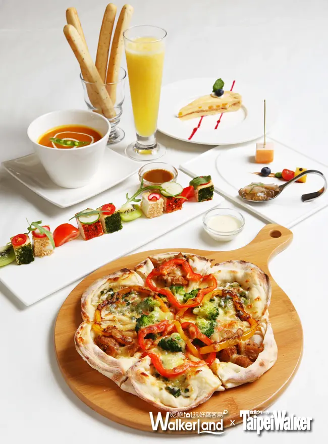 新米蘭蔬食套餐398元/套餐包含前菜、麵包、沙拉、湯、醋飲、主餐、甜點、飲料等品項,圖中幸運草披薩是店內夏季新主餐,先在餅皮抹上甜麵醬,再以猴頭菇、青蔥交錯的組合呈現,最後以紅甜椒、花椰菜綴飾,好看又好吃。>>點我看更多>>