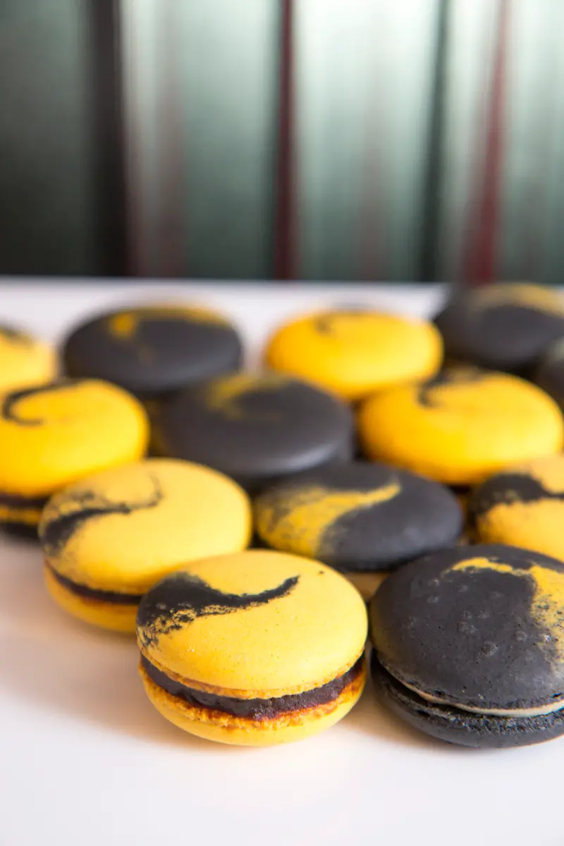 ▲「月影馬卡龍禮盒」以東方傳統的潑墨妝點方式,妝點出如月影般的大理石紋圖騰,奶皇、焦糖栗子兩款中式經典內餡融合其中,口感加倍提升,營造出濃濃的幸福團圓滋味。 (圖/維多麗亞酒店)