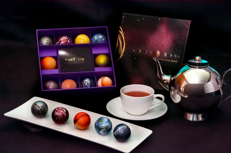 維多麗亞酒店首次以銀河星系為概念推出「星球巧克力禮盒」(10入裝),內含太陽(芒果金桔)、月球(番石榴鳳梨)、水星(伯爵金桔)、金星(杜絲香蕉)、地球(百香果番石榴)、火星(柑橘杏仁)、木星(芝麻金桔)、土星(杏仁辣椒瓜納拉)、天王星(抹茶紅豆)及海王星(咖啡珍珠米)共10種口味,即日起限量販售,售完即止。另推出「月兔鳳梨酥禮盒」(6入裝/10入裝) 及「月影馬卡龍禮盒」(6入裝/10入裝),別出心裁的精緻口感及時尚外觀,是中秋佳節送禮的最佳選擇。即日起開放預購,8/31前早鳥預購享9折優惠。