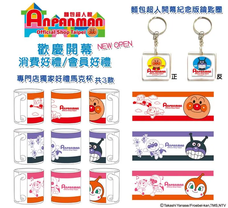 《麵包超人館 台北》慶開幕消費好禮/會員好禮:《麵包超人館 台北》,單筆消費滿1,000元,即可獲得『麵包超人開幕紀念版鑰匙圈』乙個!(共一款、正反兩面,每卡限換乙個! 數量有限,送完為止)
