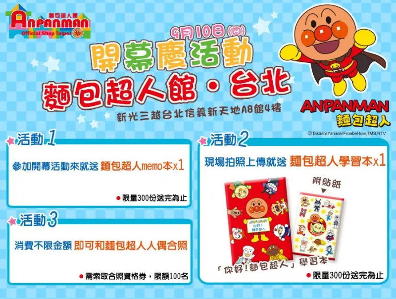 開幕當天11:00起,拍攝《麵包超人館 台北》照片(任一角度均可),上傳照片至麵【Anpanman麵包超人台灣】粉絲團並按讚,經舞台區贈品處工作人員確認無誤後,就送台灣限定的麵包超人學習本1本,限量300本送完為止。