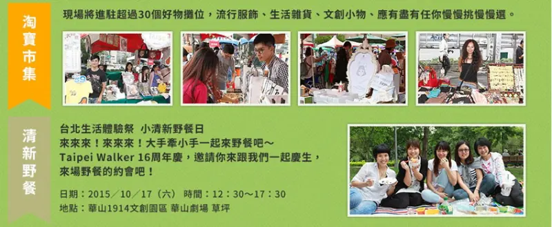 歡慶Taipei Walker 16年,現場將分為3大主題『搖滾舞台』、『淘寶市集』、『清新野餐』融入整個華山大草皮,活動將從10:30~17:30,10多位超人氣歌手輪番上場分享音樂,聽說還有一位重量級神秘嘉賓,涼涼的秋意就是要睡到自然醒,然後相約姊妹們來場dress code的野餐計畫,現場還有很多創意市集可以尋寶,微風、音樂、野餐、笑聲、市集是你假日最愜意的生活品味。