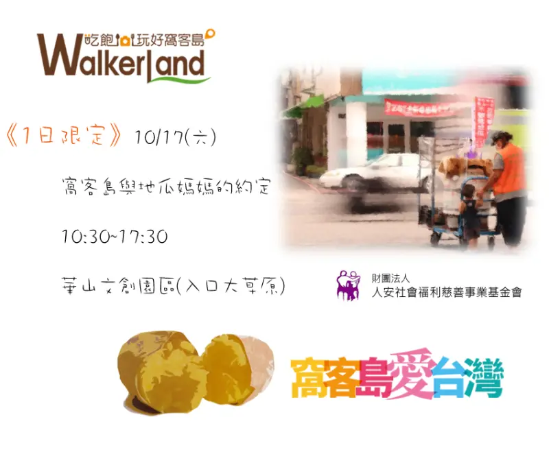 因為眷戀這塊寶島我們選擇地瓜,因為疼惜單親媽媽我們選擇人安基金會,窩客島不只專門發掘美食旅遊,其實對社會責任及關懷也是不可或缺的,其實在社會的角落,有一群人為了生存、為了孩子,咬牙苦撐。盼大眾給予「機會」及「關懷」,助其自立,為社會創造美好。人安、創世策略聯盟輔導單親媽媽「給魚給竿 拉人一把」烤地瓜謀生方案助其自立,這次歡慶Taipei Walker 16週年,歡迎大家一起跟窩客島關懷社會,做愛心!!