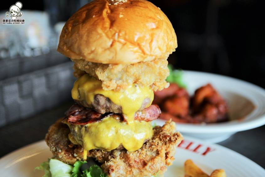 啤酒肚特製漢堡塔(牛肉*2、炸雞、炸魚*3、厚切培根*2)光是端上來我都飽了,好彭派唷~~