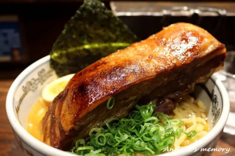 一本拉麵主打的就是那霸氣破表的巨無霸叉燒 ,這塊號稱17cm長五花肉。